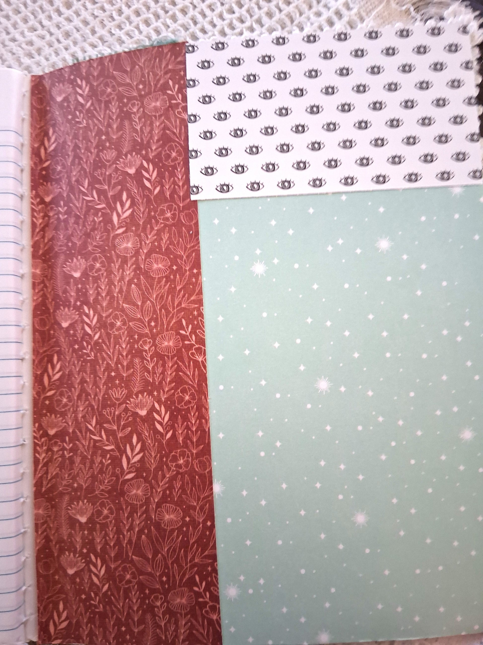 This journal (altered composition book) is lovingly designed with a stunning mixed-media cover that combines textured fabrics, delicate paper florals, and celestial-inspired patterns.